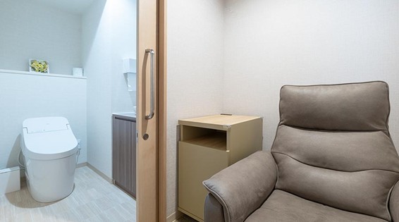 大腸カメラ検査で多くの方が負担に感じるのが、下剤の服用です。この準備時間を少しでも快適に過ごしていただけるよう、当クリニックでは、院内にトイレ付きのプライベート個室をご用意しています。